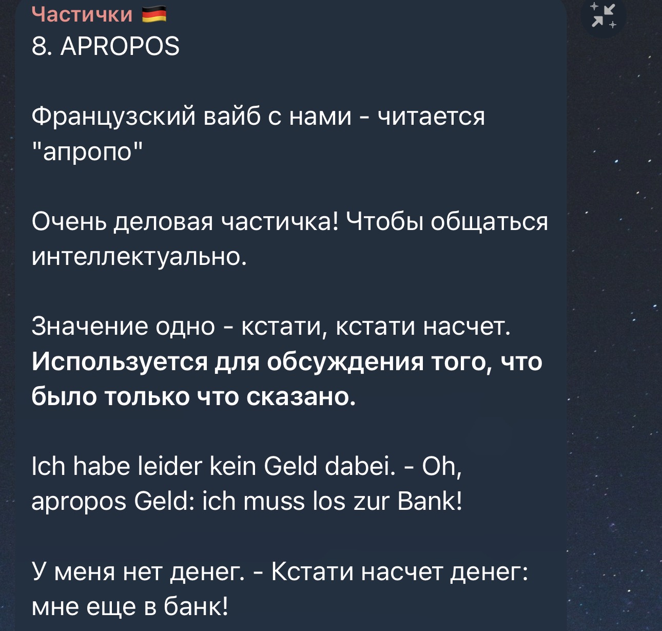 После оплаты Вы получаете доступ к телеграм каналу со всеми материалами. Каждая частица представлена как теория и практика. В теории я расписал основные значения и дал примеры. В практике Вы отрабатываете упражнения и при желании высылаете их на проверку мне. Вот так выглядит телеграм канал курса. Цена курса - 30 евро.